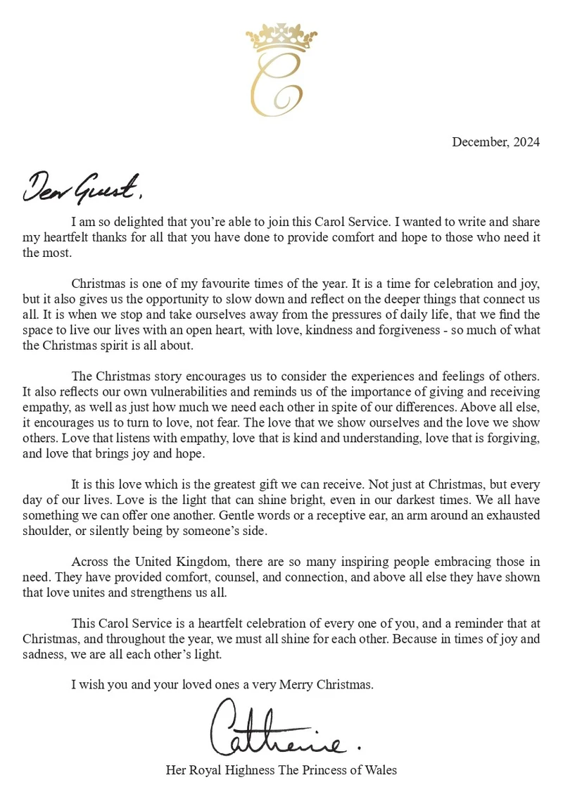 Kate signed the letter with her handwritten signature “Catherine”, accompanied by: “Her Royal Highness The Princess of Wales.”